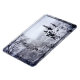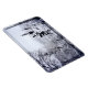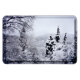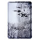 Uma fotografia mostrando apenas um vislumbre do lago da montanha através de abetos cobertos de neve. Esta imagem de paisagem é manipulada digitalmente para parecer uma aquarela.