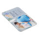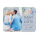 Esta imã salve a data de fotos de folhetos azuis é perfeita para um casamento de primavera ou verão. O design da delicada apresenta peônias azuis leves, organizadas com pessegueiros e flores cremosas em um buquê lindo. Personalize o imã com sua foto de noivado, nomes, data de casamento e local.