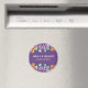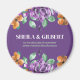 Ímã de Salve A Data com flores amarelas roxas em moldura arredondada feito com aquarela estilosa. Atmosfera de aquarela roxa e verde para o seu tema de casamento criativo e sagrado.