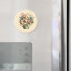 Ímã com uma imagem fofa. Flores azuis, rosa e creme com folhas verdes. Colocadas dentro de um vaso de flores verde com um pano xadrez verde pendurado na lateral.