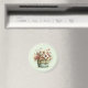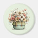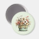 Ímã com um vaso de flores caprichoso e elegante. Cores verde, rosa e creme. Colocado em um vaso verde com um pano xadrez. Estilo vintage desgastado.