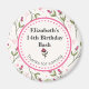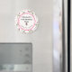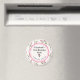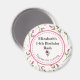 Um favor de festa de aniversário, ímã de agradecimento. Ilustrado com os detalhes do seu evento dentro de uma moldura de cor branca casca de ovo com uma borda pontilhada de rosa. O fundo é um padrão de flores silvestres rosa desenhadas à mão com longos caules e folhas verdes em um fundo de cor branca casca de ovo. Círculos rosa e ramalhetes também decoram o design. Design floral caprichoso e bonito.