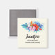 Íman de evento com um vibrante e belo buquê de flores tropicais. Orquídeas, hibisco e folhas tropicais. Cor rosa, turquesa, vermelha e azul.