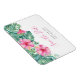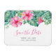 Estes noivos salvam a data em que ímanes exibem uma parte superior de flores e folhas de palma rosa-tropicais. Use os campos modelo para adicionar seu texto personalizado. Para ver mais convites e ideias de casamento de destino, visite www.zazzle.com/dotellabelle Arte e design de aquarelas únicas de Victoria Grigaliunas do Do Tell A Belle.