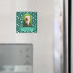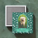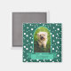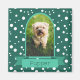 Enquadre uma foto vertical do seu animal de estimação em um quadro de arco clássico em teal com um cartaz para o nome dele ou dela. O fundo é bolinhas brancas em pó.