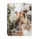 Feliz Natal com uma estrela dourada confetti e uma moldura dourada para fotografia. Personalize a foto e personalize os detalhes para adicionar o nome da família. Adicione suas mensagens ou sessões de saudação às costas. Um fundo verde sábio com a tipografia cursiva moderna de Branca de Neve.