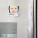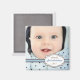 Uma bela design que faz uma bela manutenção para a família e os amigos. Possui uma foto do tamanho do cheio do seu lindo bebê e o ímã é embrulhado por uma fita dupla falsa em chocolate marrom e azul de inverno, com um espaço bonito para as informações importantes.