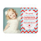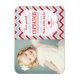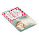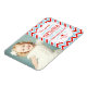 Padrão de listras brancas, vermelhas e azuis em fêmur no fundo. Na moda, onde se lê "Tenha um Natal muito feliz cheio de paz, amor e alegria". Personalize-o com sua foto favorita e seu nome de família.