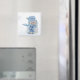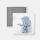Um ímã com uma fotografia fofa de um pequeno boneco de neve. Lá fora, no inverno, com neve caindo por toda parte. Esta cara bonita está vestida de chapéu azul e cachecol.