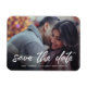 Imã salve a data de fotos moderna com a imagem de sangria horizontal do cheio com uma sobreposição de texto. As palavras "salvar a data" estão em uma fonte de escrita manual de script de pincel branco. Um design simples, mas elegante, que faz da sua foto o recurso principal.