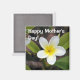 Esta bela flor de Plumeria / frangipani, com as suas cinco pétalas, branca no exterior e amarela clara no centro, folhas verdes e um galho castanho no fundo, faz um adorável cenário para o Dia de as mães Feliz desejo na imã de geladeira!