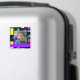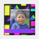 Modelo de foto personalizada e texto, com a imagem cercada por uma borda colorida dos anos 80. O impressão de cor neon fluorescente do estilo 80s com um padrão geométrico. Este design de moda da década de 1980 tem quadrados de fluoro coloridos, linhas, triângulos, quadros e retângulos de cores quentes verdes, azuis, cor-de-rosa, púrpura, azul e laranja com fundo preto. Este padrão retrógrado dos anos oitenta seria apelativo para qualquer um que ama a anos 80 ou ama cores e formas brilhantes e ousadas. Há também espaço para texto personalizado em azul em um banner roxo.