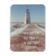 No caminho para um destino mais feliz, uma citação de encorajamento e esperança. Uma fotografia envolvente de um farol em um dia legal de blustery com o brilho do sol começando a passar.