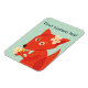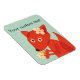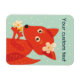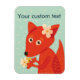 Magneta de raposa bonita com uma ilustração vetorial de uma raposa de desenho animado com grandes olhos e flores na cabeça, segurando um monte de flores em suas patas. Este ímã bonito tem texto personalizável. O trabalho de arte tem cores brilhantes, laranja claro e azul claro, e é simplesmente divertido. Tem fundo azul claro com bolinhas quase brancas.