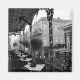 Imagem a preto e branco da sacada do Royal Cafe no Quarter Francês de Nova Orlean. As pessoas se amontoam por debaixo das frentes de tempestade para saírem da chuva que vaza.