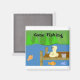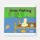 Uma legal cena de um pequeno urso sentado numa doca a pescar peixe. Parece que ele pegou um. Peixes flutuando por e seu balde de vermes atrás dele. Cores brilhantes e um ditado fofo.