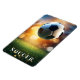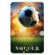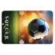 Este ímã flexível é mostrado com uma impressão artística de uma bola de futebol esportivo.
