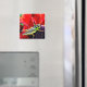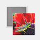 Este ímã brilhante apresenta um gafanhoto verde-brilhante, amarelo e preto, pregado no centro roxo de uma flor com pétalas vermelhas lindas.
