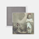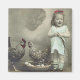 Vintage Magnet, de menina parada com um galo e galinha com a galinha em cima de seus ovos.