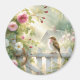 A soft watercolor scene captures a gentle songbird resting on a white garden fence surrounded by blooming pink roses, leafy vines, and warm morning light. The palette glows with pastel greens, blush pinks, creamy whites, and sunlit gold, creating a calm cottagecore atmosphere filled with quiet charm. Loose painterly brushstrokes and airy light give the artwork a whimsical folk feel, evoking peaceful garden mornings, vintage storybook illustrations, and romantic shabby chic beauty. AI generated artwork.
