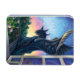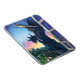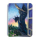Gargoyle Guardian Art de Traci Van Wagoner impressões, posters, acessórios e presentes mostra um gárgula de pedra azul e cinza olhando para você desde o alto de sua área acima da cidade no início da manhã com um céu ensolarado texturizado de amarelo, laranja, rosa, violeta e azul. Arranje um guardião de gárgula hoje para te vigiar.