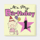 Camisetas de aniversário, festas, cartões, autocolantes, ímanes, bolsas e outros presentes de primeira aniversário com uma menina de camisa rosa, fralda e chapéu de festa com balões de aniversário!