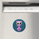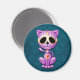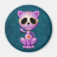 Este adorável design de gatinho roxo é decorado com espirais e padrões ponto. Pedais de flores amarelas circundam os olhos negros puros na tradição do Dia dos Pântanos de Açúcar Morto. O gato está sentado, olhando para frente com sua cauda acenando ao fundo. A cabeça grande fica sobre um corpo minúsculo que cria uma aparência divertida, como um desenho. Uma estrela de cinco pontos fica no meio da testa do gatinho enquanto um coração vermelho e amarelo brilhante aparece no centro do peito. Uma sombra cai sobre o fazer de fundo azul profundo que o design parece flutuar logo acima da superfície deste ímã. Este gatinho bonito é um design divertido e na moda inspirado pelas belas padrões do Dia dos Pelos Crânios do Açúcar Morto.
