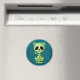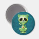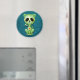 Este adorável design de gatinhos verdes é decorado com espirais e padrões de pontos. Pedais de flores amarelas circundam os olhos negros puros na tradição do Dia dos Pântanos de Açúcar Morto. O gato está sentado, olhando para frente com sua cauda acenando ao fundo. A cabeça grande fica sobre um corpo minúsculo que cria uma aparência divertida, como um desenho. Uma estrela de cinco pontos fica no meio da testa do gatinho enquanto um coração vermelho e amarelo brilhante aparece no centro do peito. Uma sombra cai sobre o fazer de fundo azul profundo que o design parece flutuar logo acima da superfície deste ímã. Este gatinho bonito é um design divertido e na moda inspirado pelas belas padrões do Dia dos Pelos Crânios do Açúcar Morto.