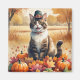 Uma pintura em forma de aquarela de um Gato alegre sentado em meio a uma pilha de folhas vibrantes de queda, cercado por pequenas abóboras e bolotas espalhadas. O Gato veste um chapéu de peregrino e fede de alegria, capturando o espírito da Ação de Graças. No fundo, campos de colheita suaves e árvores abrigadas em ouro criam um ambiente rural pacífico. Texturas gentis e tons de outono aquecidos dão à cena uma sensação acolhedora e nostálgica de celebrar a beleza da estação.