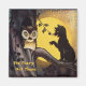 Cartaz do Vintage Halloween mostrando um gato um pouco pesado gritando um aviso para a coruja de olhos largos da árvore. Reimpresso neste ímã.