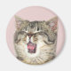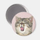 Um gatinho de mesa marrom com a boca aberta numa grande língua enrolando bocejo, ou talvez ele esteja cantando para você, foto-ímã.