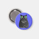 Gato de desenho gordo preto com olhos verdes. Caráter bonito de gato. Ímanes personalizados com efeito antigo de impressão aplicado à imagem. Fundo azul. Editar texto para personalizar. Ideia de presente para amantes de gatos.