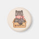Gato cinza fofinho sentado confortavelmente dentro de uma caixa de papelão. O txt "Se cabe, senta" está expressando a regra comportamental inata do gato.