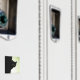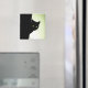 Gato preto vadio com olhos verdes esmeraldas olha por trás da parede preta para uma sala verde.