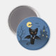 Gato preto de desenhos bonitos com asas de morcego. Uma árvore morto, uma mansão assustadora, alguns morcegos, e a lua são vistos no fundo.