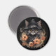 Um ímã com uma ilustração fofa. Um gato preto de cabelos longos vestindo o chapéu de uma bruxa negra. São orelhas vomitando. Cercado por flores laranja e castanhas de outono. Perfeito para amantes de gatos.