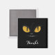 Um gato preto fofo e malicioso com olhos laranja amarelos grandes em forma de amêndoa e pequenas presas brancas fofinhas se misturando em um fundo preto. Obrigados gravados em uma fonte branca rico.