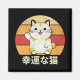 Ilustração colorida com design de texto de "Gato Sortudo" em japonês e um gato Kawaii criando uma decoração manual sobre fundo retro listrado