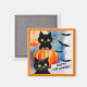 Foto bonita de dois gatos pretos com abóboras e morcegos, é apresentada neste ímã para o Dia das Bruxas. A mensagem no imã "Feliz Dia das Bruxas" faz disto uma bela decoração para casa ou para o escritório para o Halloween. Faz um presente excelente também!