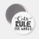 Imã de geladeira moderna divertida e encantadora com as palavras "Gatos governam o mundo", decorada com bigodes brancos, arranhões de gatos, um ratinho minúsculo e uma pata.