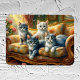 Este Magnet apresenta 4 felinos fazeres confortáveis no sofá da sala - uma cena fofa em um olhar antigo. Para todos os amantes de gatos! Uma pequena ideia bonito para muitas ocasiões.