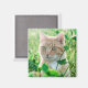 Fotografia de um gengibre com olhos verdes pálidos sentou-se em erva verde longa.
