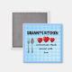 Este ímã será um excelente presente para a sua avó. Diz "Cozinha da vovó - Refeições caseiras servidas com amor." O fundo é gingham azul claro.