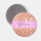Glam e rosado feminino, pêssego, brilho dourado brilha o nome do monograma branco e o ímã inicial. Seu nome personalizado e monograma são escritos em um elegante roteiro escrito à mão com um fundo rosa. Você pode alterar a cor do texto, o estilo e o tamanho da fonte usando a opção personalizar. Um aniversário perfeito ou presente de Natal!