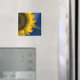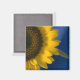 O girassol bonito no Blue Magnet fabrica geladeira de excelente ou arte de arquivo para um amante de flores, jardineiro ou florista. Este elegante ímã de girassol apresenta uma fotografia macro-natural próxima de uma flor de girassol amarela e uma folha verde sobre fundo azul.