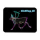 Uma renderização brilhante, semelhante a neon, de uma rena, também conhecida como rena. O texto islandês que lê "Gleðileg jól" (Feliz Natal) aparece em azul e branco brilhantes.