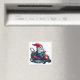 Uma ilustração brilhante de um gnomo alegre cavalgando um cortador de grama vermelho, flores de carregando. O design vivo exibe cores vibrantes e uma atmosfera lúdica.