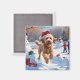 Imã Goldendoodle correndo em neve com chapéu de Natal