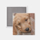 Um adorável Goldendoodle, de onze semanas, com olhos brilhantes, curiosamente sai de uma porta em um muro de tijolos