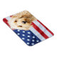 Goldendoodle senta orgulhosamente em frente à bandeira americana no Dia do Memorial.